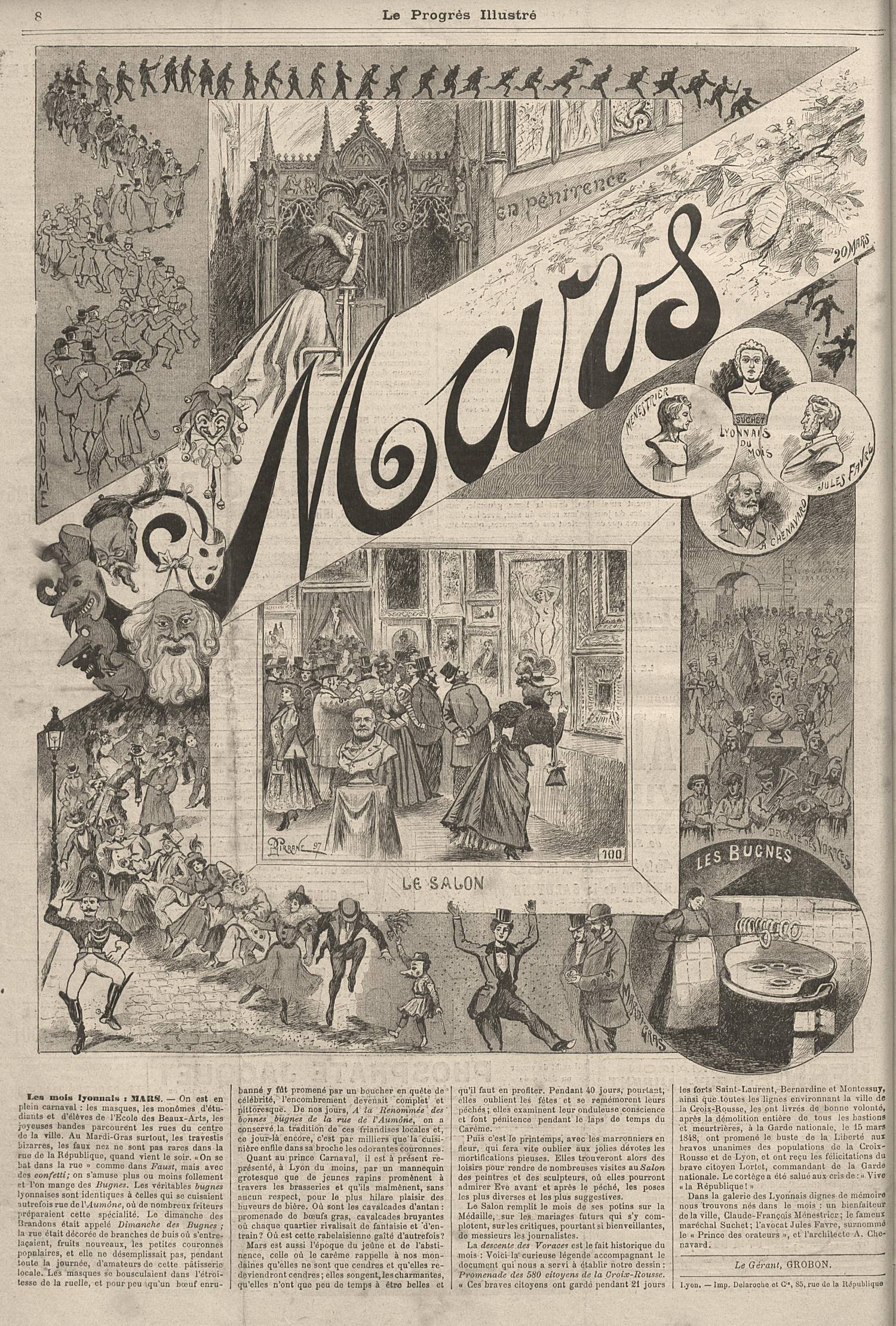 - Dans le Le Progrès Illustré du 7 mars 1897, nous trouvons une autre illustration du défilé des Voraces du 15 mars 1848 que l’on voit à droite du tableau central intitulé Le Salon, avec le texte suivant: «La descente des Voraces du 15 mars 1848» est le fait historique du mois: voici la curieuse légende accompagnant le document qui nous a servi à établir notre dessin «Promenade des 580 Citoyens de la Croix-Rousse». «Ces braves citoyens ont gardé pendant 21 jours les forts Saint6laurent, Bernardine et Montessuy ainsi que toutes les lignes environnant la ville de la Croix-Rousse, les ont livrés de bonne volonté, après la démolition entière de tous les bastions et meurtrières, à la Garde nationale, le 15 mars 1848, ont promené le buste de la Liberté aux bravos unanimes des populations de la Croix-Rousse et de Lyon et ont reçu les félicitations du brave citoyen Lortet, commandant de la Garde nationale. Le cortège a été salué aux cris de «Vive la République».