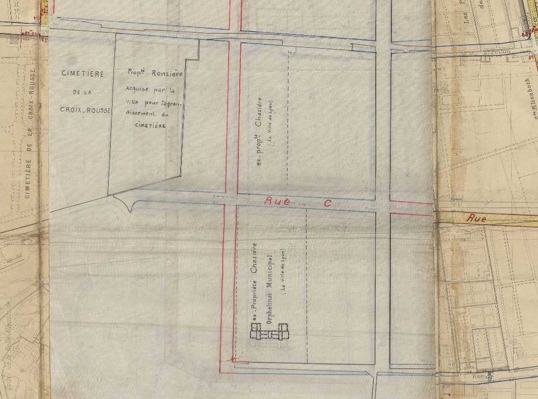En effet, sur ce plan de 1899 concernant un Projet d'élargissement et de prolongement de plusieurs voies, création d'une place publique, Ville de Lyon. 4e arrondissement, le bâtiment de l’orphelinat municipal de filles figure seul sur la parcelle.